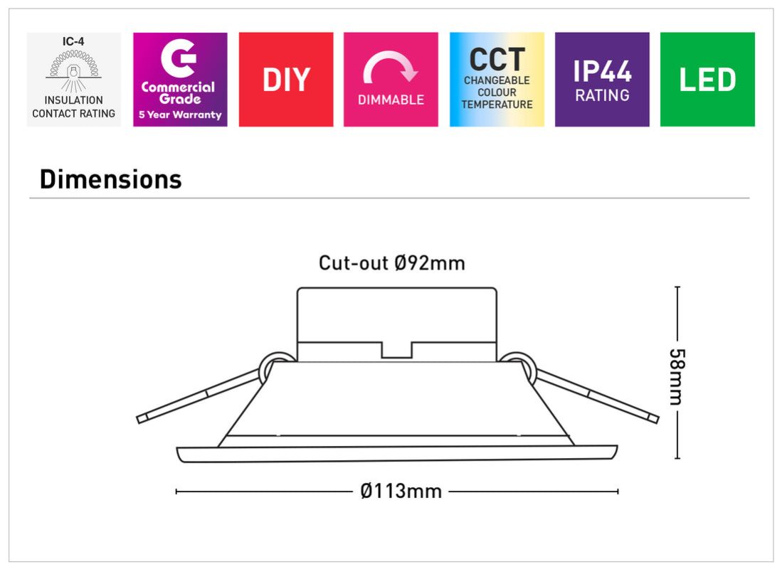 8W LED downlight with Integrated driver IP44 rated (front face) 92mm cut-out IC-4 rated Switch between 3000K/4000K/6500K colour temperature Fitted with lead and plug Leading and Trailing edge dimmable Beam Angle 60° 5 year warranty, suitable for Commercial applications